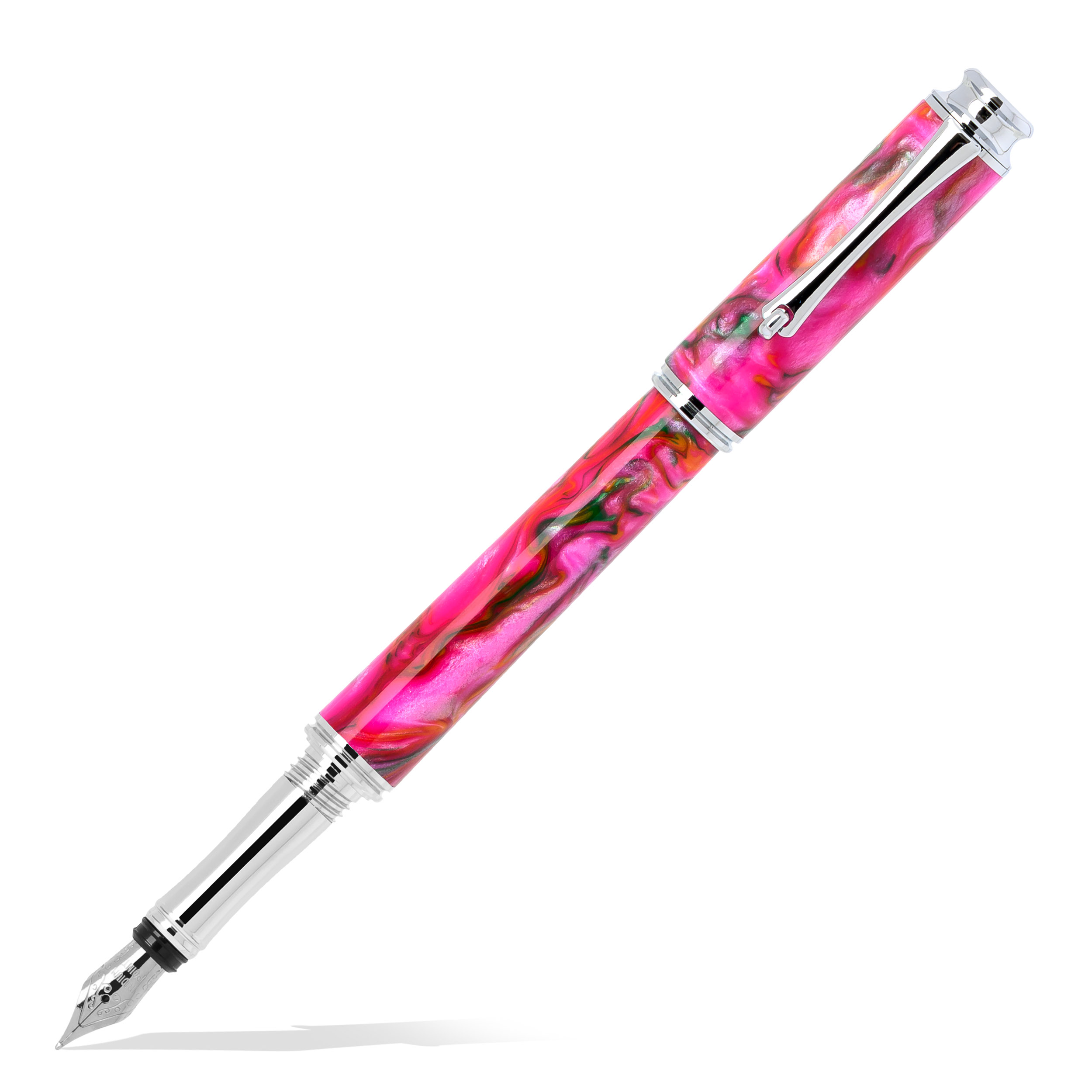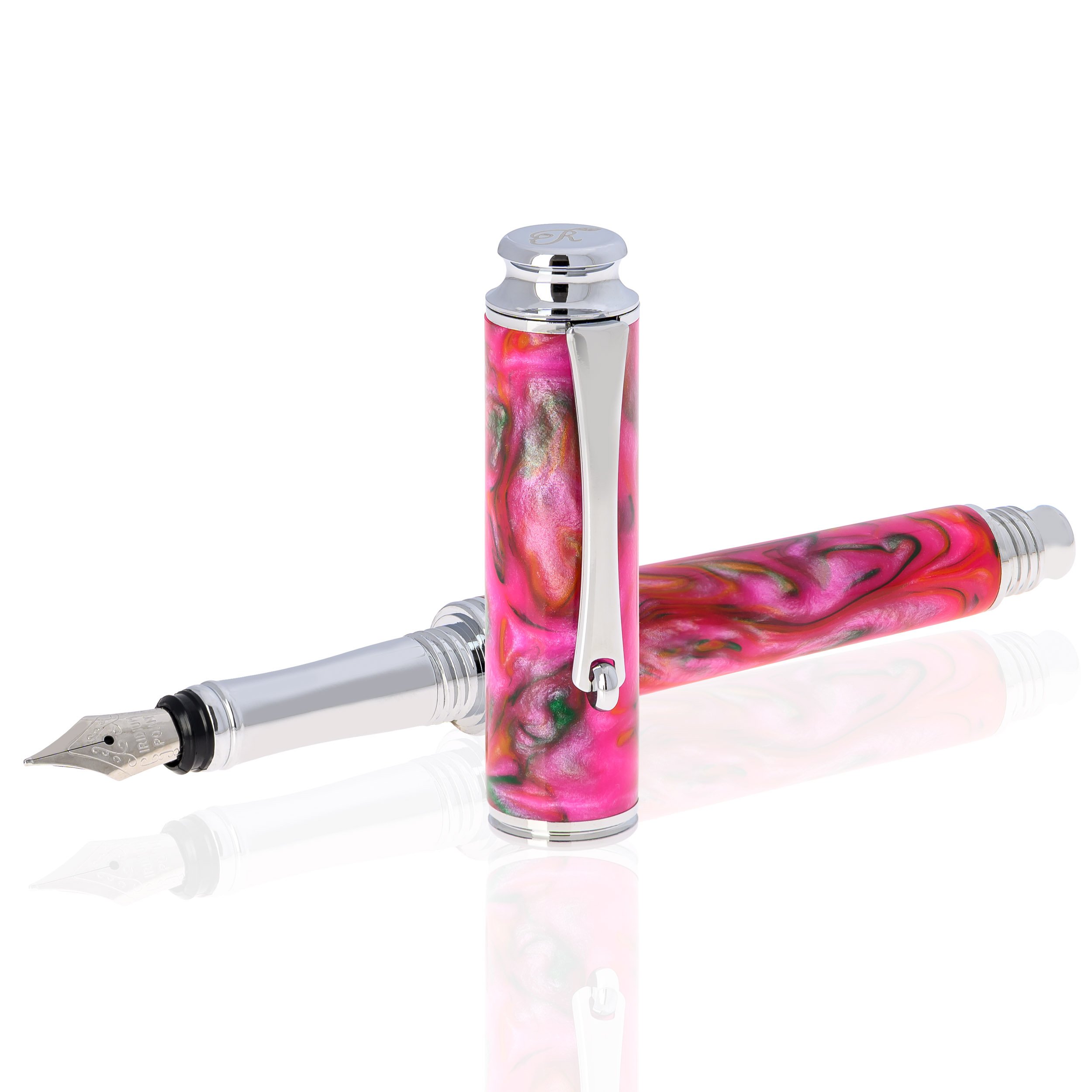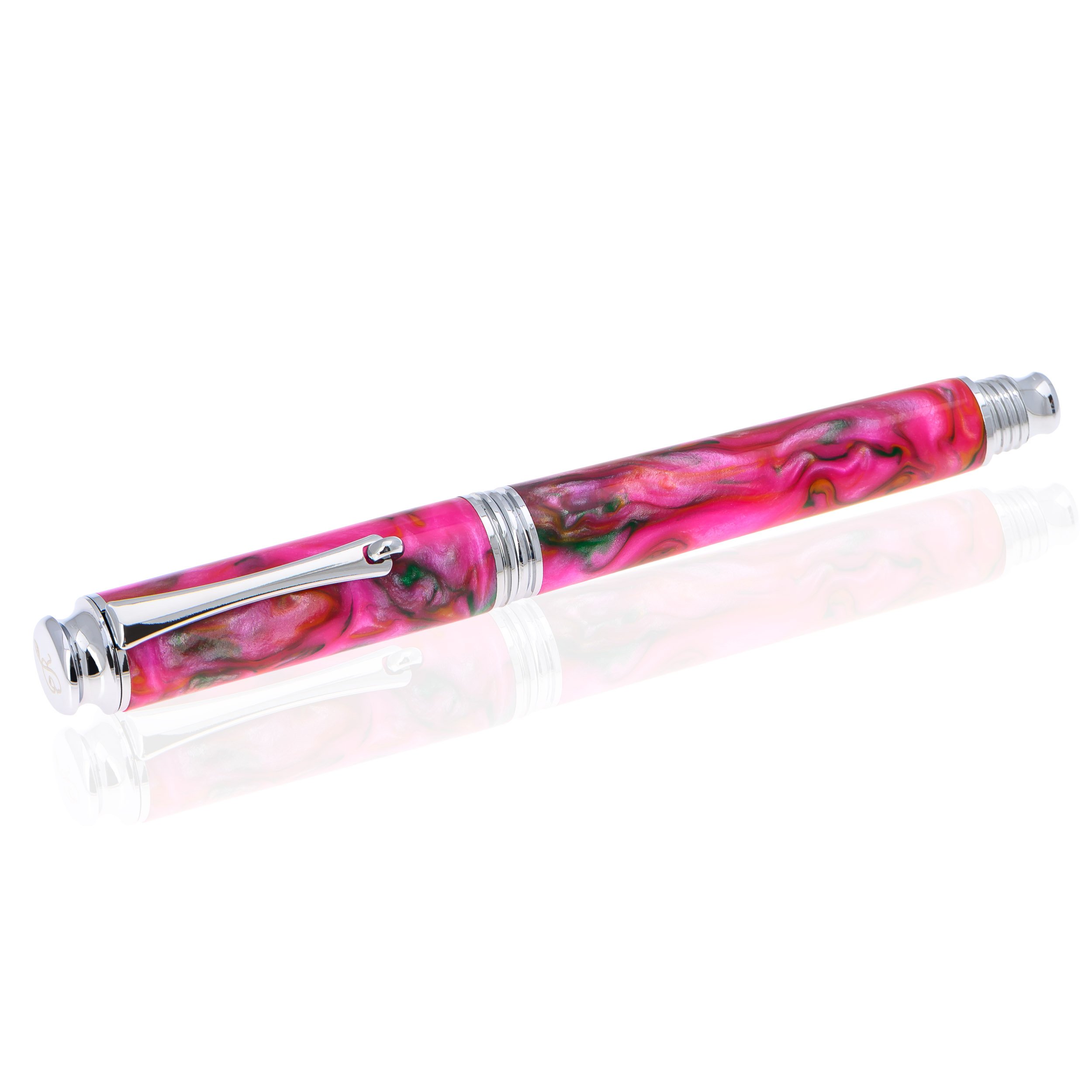 „Candy Flavor” este o celebrare a dulcelui rafinat. Corpul din rășină roz, amestecat cu nuanțe multicolore sidefate, evocă delicatețea și strălucirea bomboanelor sticloase, invitând la un gest de scris plin de plăcere. Clemele și inelele argintii completează armonios designul, adăugând o notă subtilă de eleganță sofisticată… iar pentru claritate, stiloul nu este comestibil, oricât de apetisant ar arăta! 🍬✒️