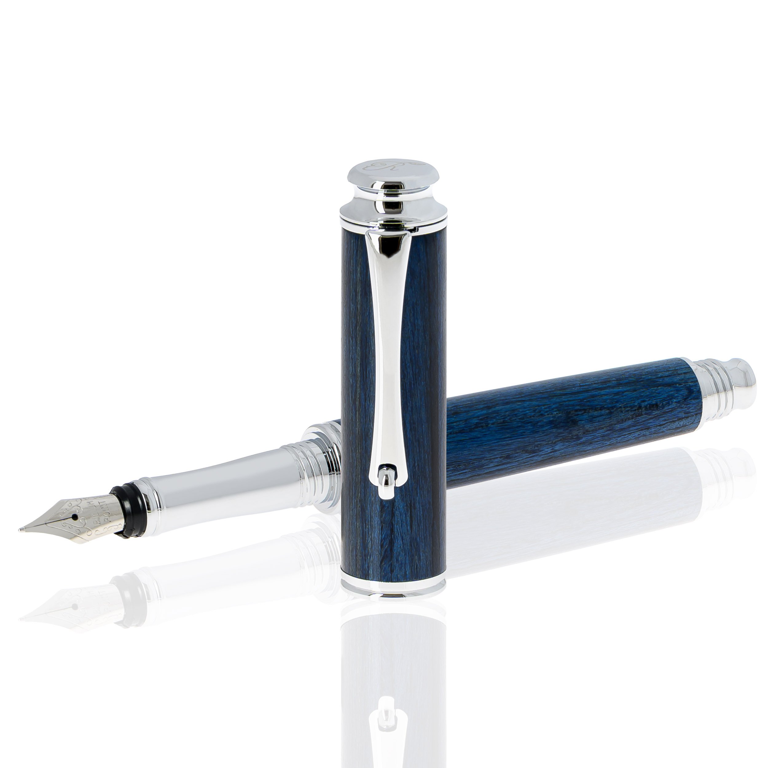 Albastrul intens al lemnului, cu irizații naturale, scoate în evidență textura fiecărei fibre, slefuită manual cu răbdare. Inelele, clema și penita argintie adaugă un accent de eleganță discretă, sugerând rigoare și precizie. Un stilou care combină frumusețea naturală a lemnului cu detaliile metalice, pregătit să scrie cu calm, eleganță și hotărâre.