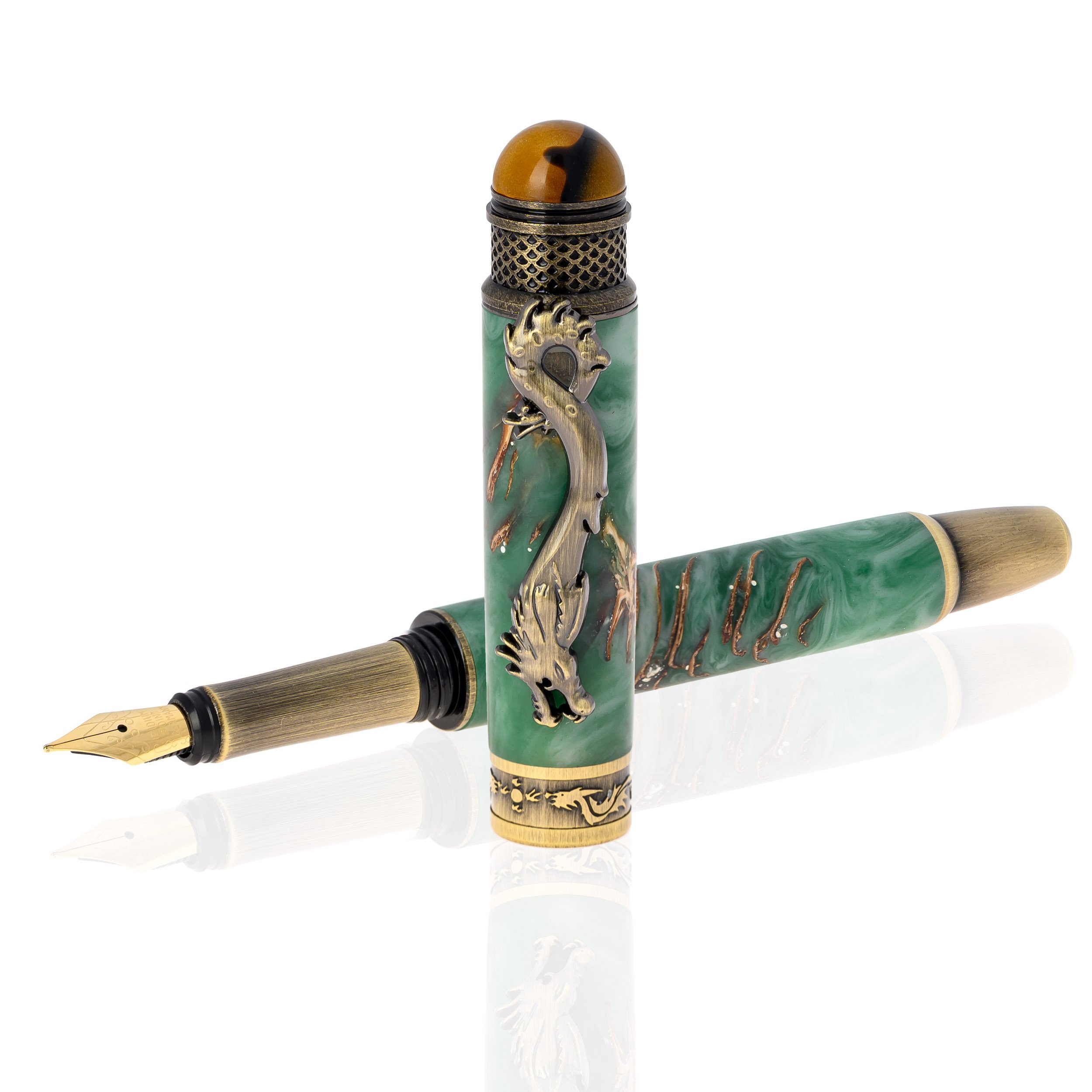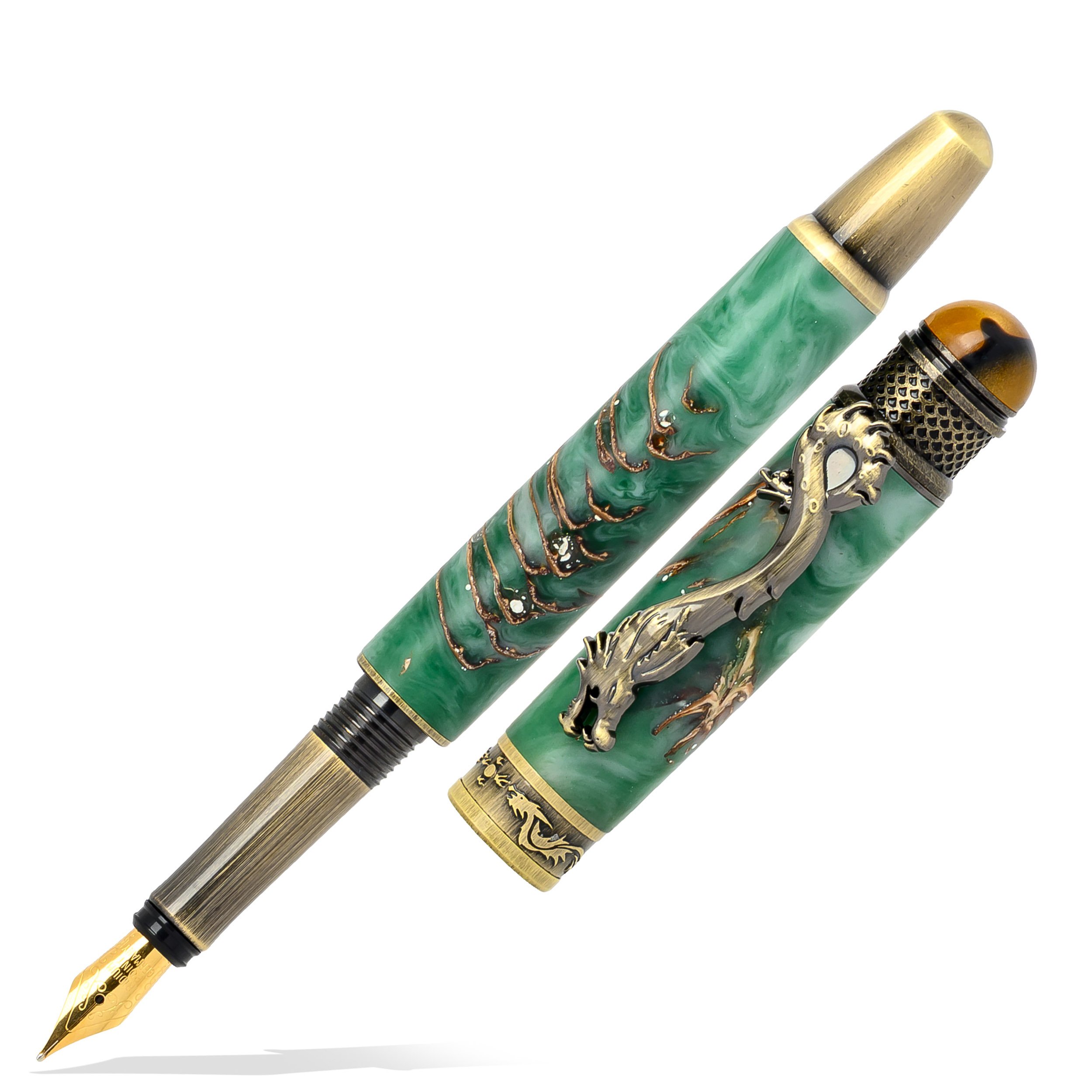 Stiloul„Dragon” te poartă într-un univers între legendă medievală și fantezie SF. Corpul din rășină verde încorporează un con de pin autentic, iar dragonul tridimensional de pe clema aurie pare gata să isi ia zborul. Inelul principal, gravat cu dragoni care scuipă flăcări, și capătul capacului, cu un pin în nuanțele lemnului și un inel metalic cu accente medievale, completează aura mistică și elegantă a acestui stilou.