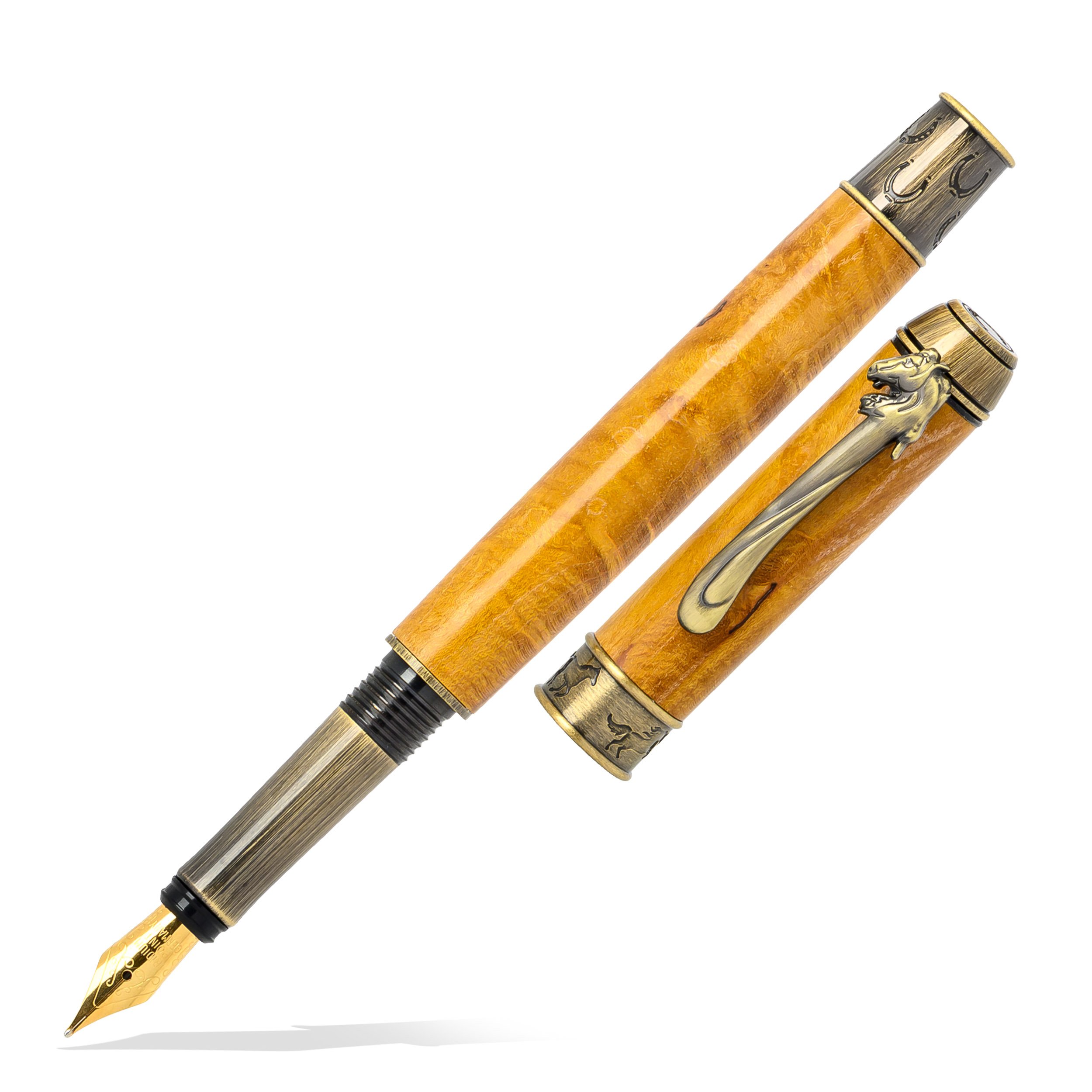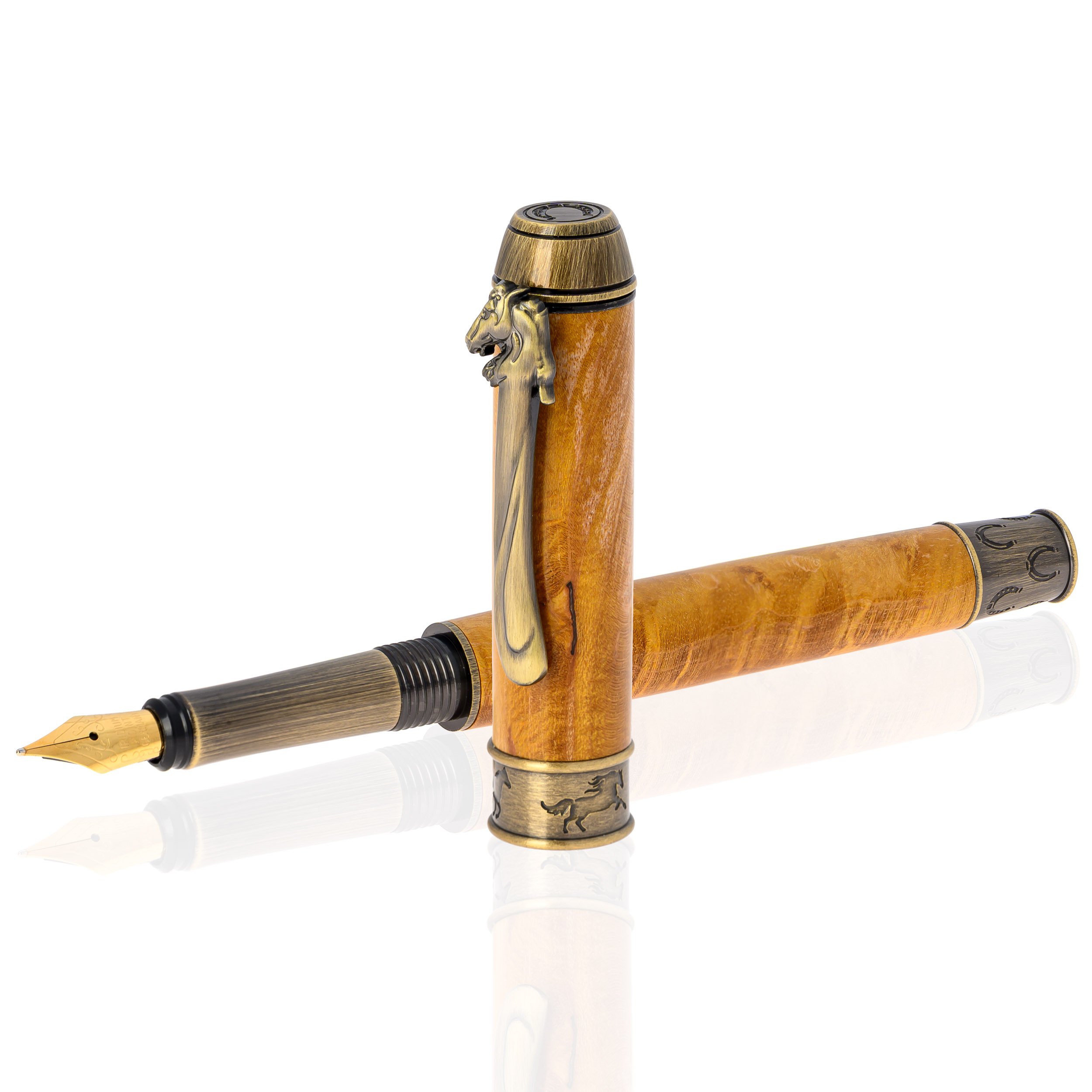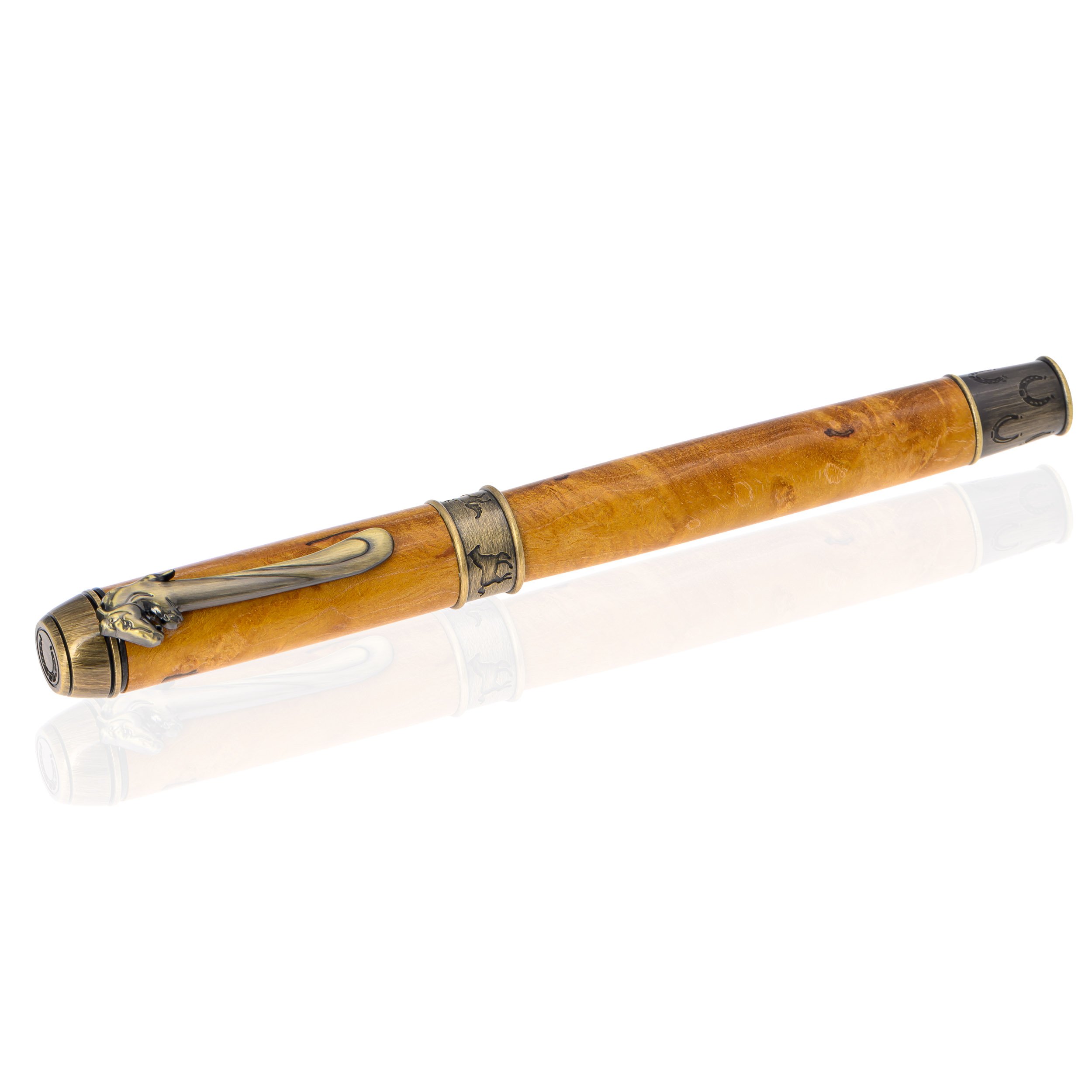„Echitație” îmbină rafinamentul cu pasiunea pentru călărie. Stiloul, din lemn autentic, șlefuit și lacuit, se remarcă prin clema aurie vintage în formă de cap de cal, iar inelele metalice, gravate cu cai și potcoave, evocă grația, norocul și eleganța celor care prețuiesc universul ecvestru.