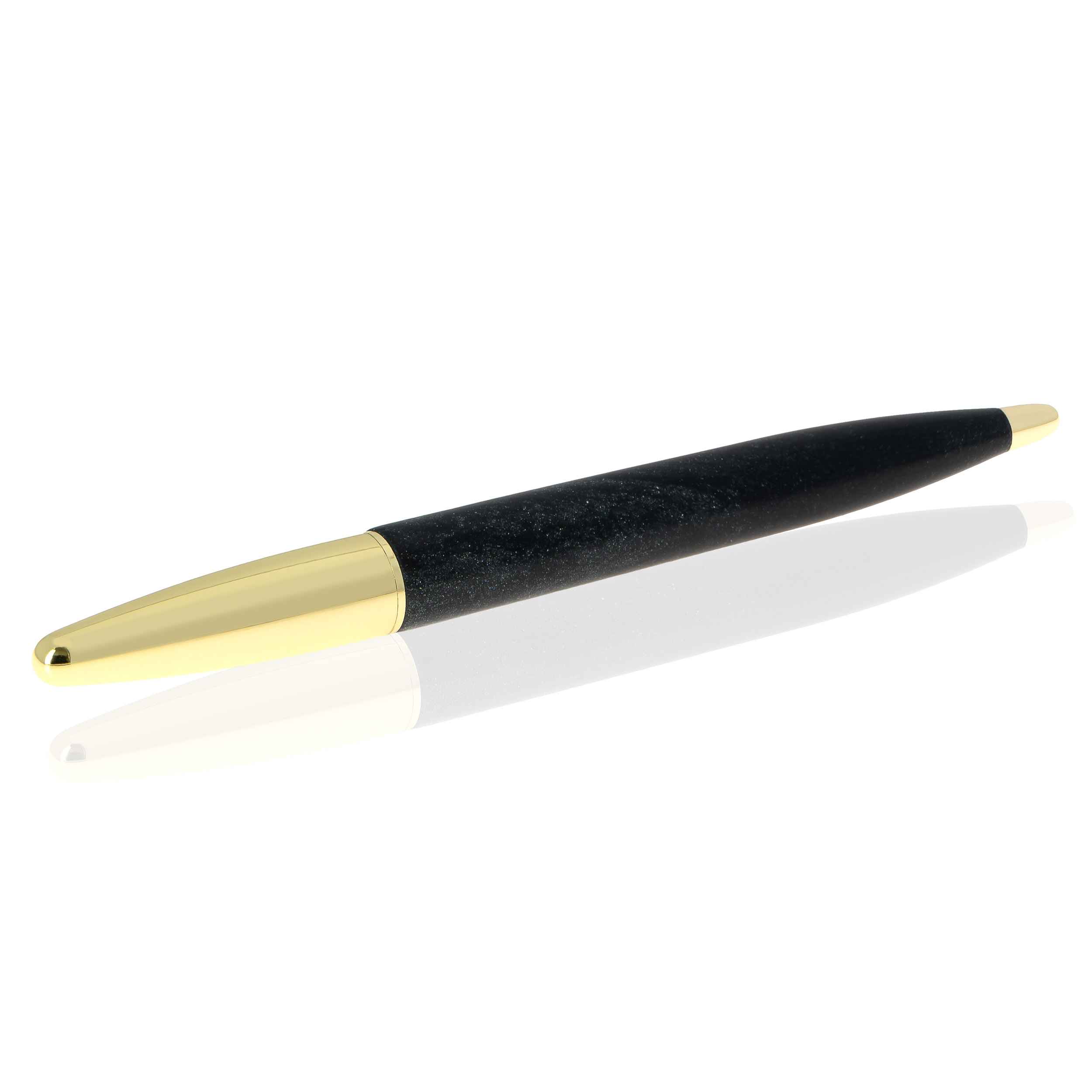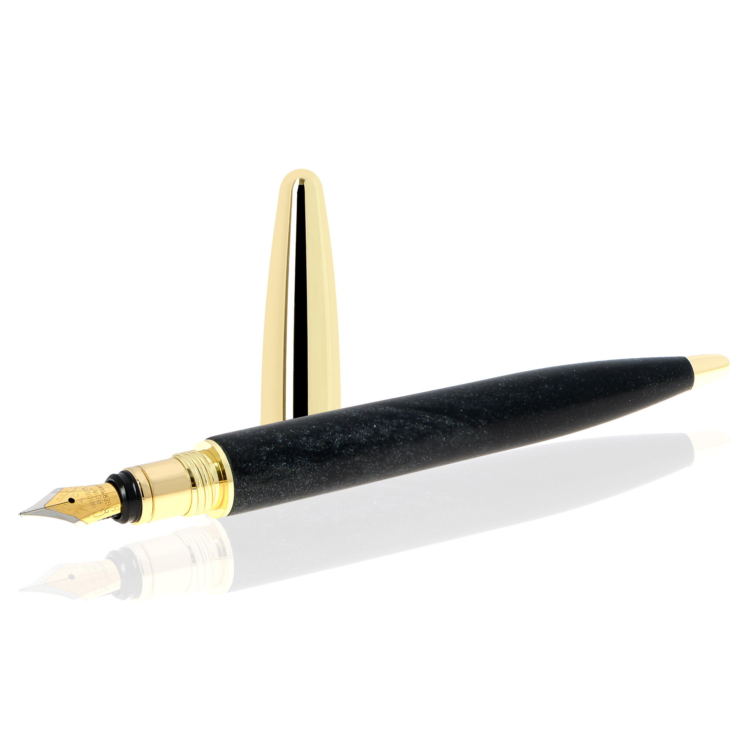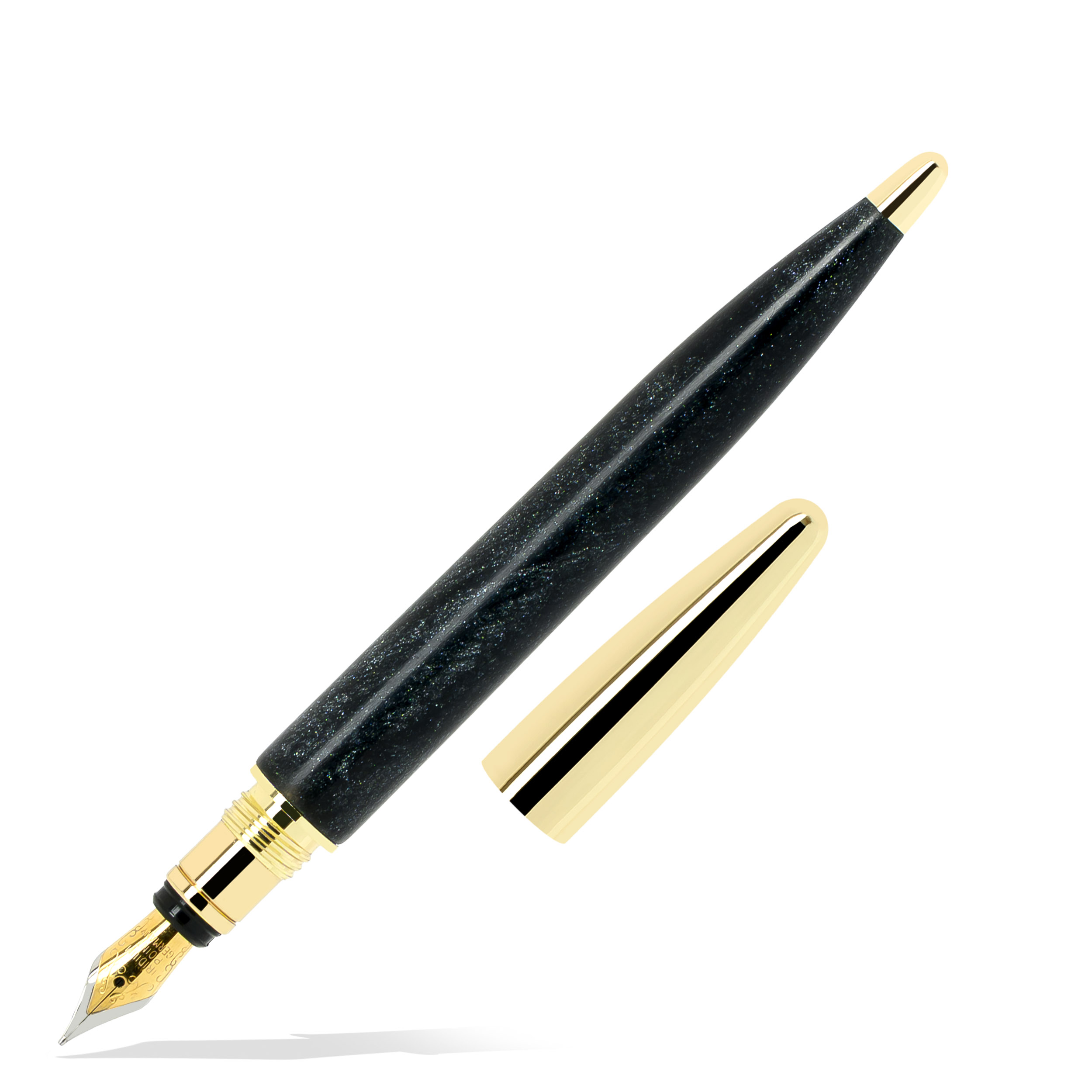 Material corp : rășină şlefuită manual. Capacul se deschide prin desfiletare si nu se ataseaza corpului stiloului in timpul scrierii.