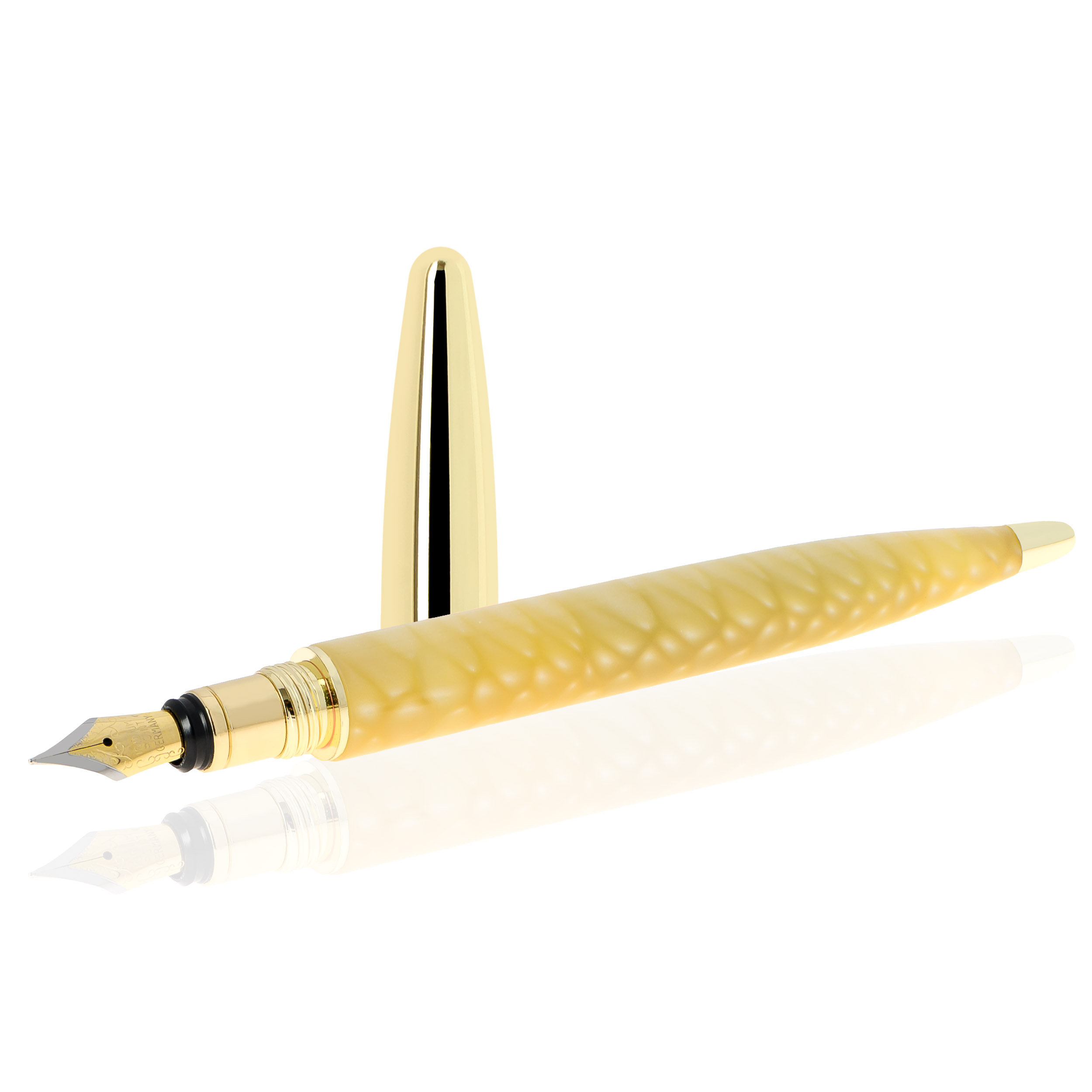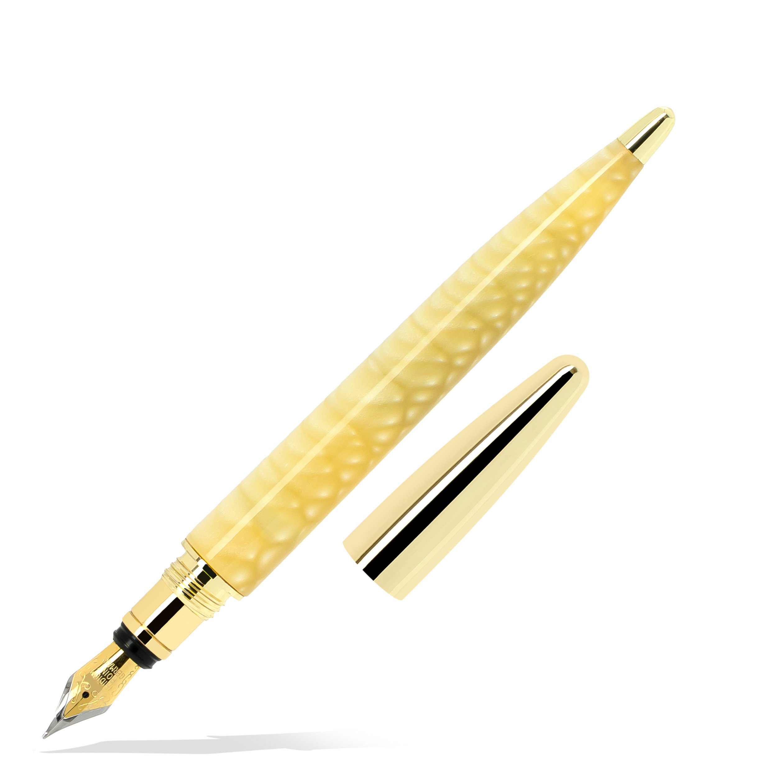 Material corp : rășină şlefuită manual. Capacul se deschide prin desfiletare si nu se ataseaza corpului stiloului in timpul scrierii.